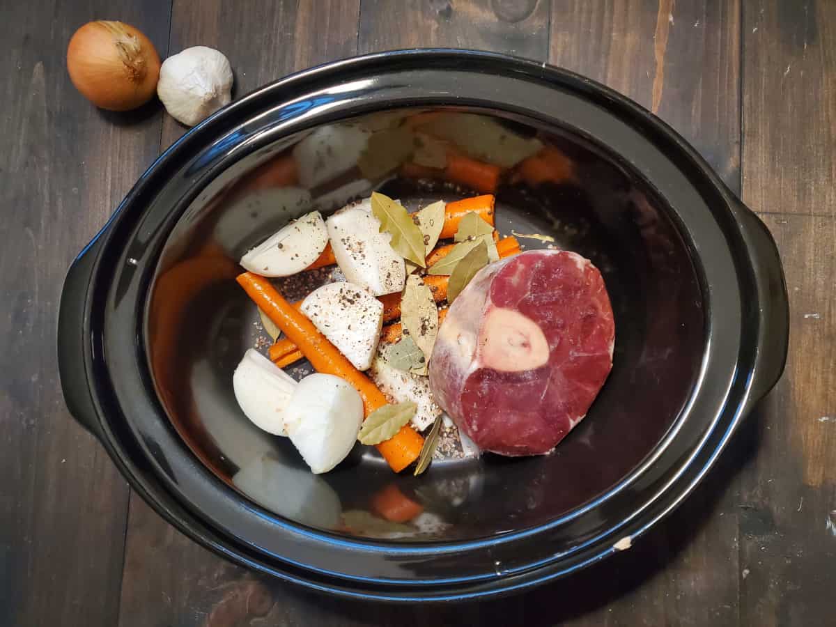 - Step 2: Pour water onto the veggies and bones and cook for up to 24 hours on low.