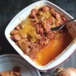 To prepare the casserole, take an 8x8 dish and put a layer of tostones on the bottom, then half the chili mixture, then half the cheese. Repeat.